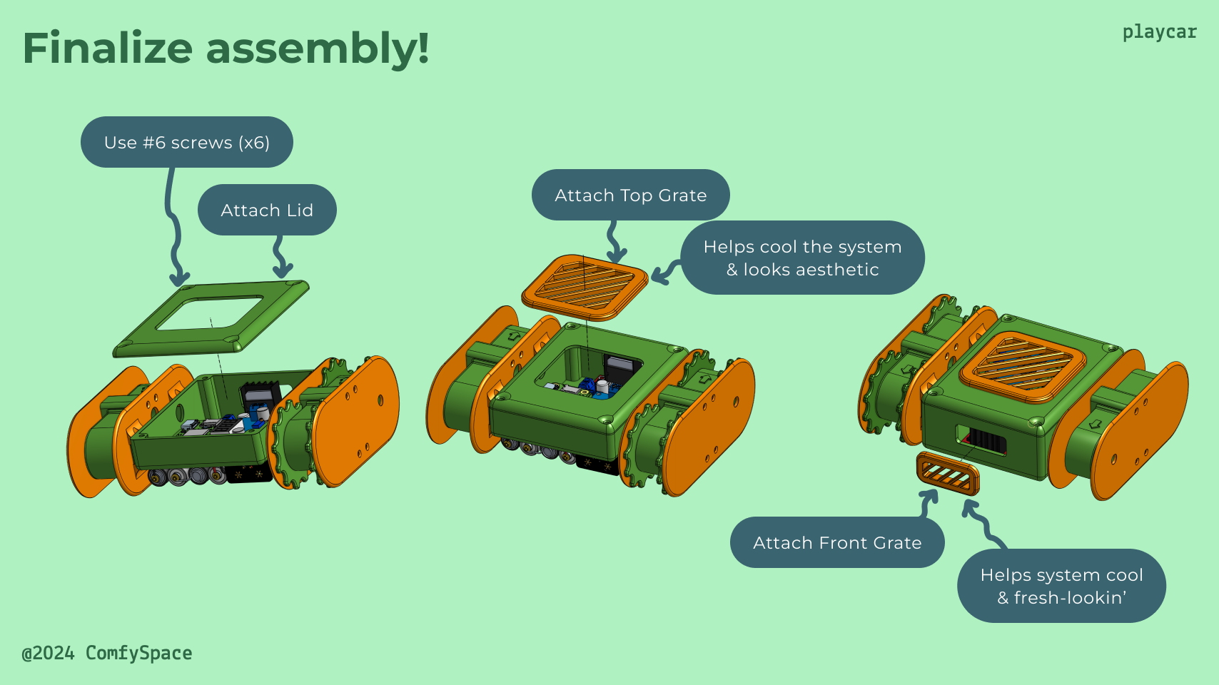 Congrats on your Playcar! Enjoy it, show it to neighbors, and share online. Email me a picture or video at thomas@comfyspace.tech to brighten my day!